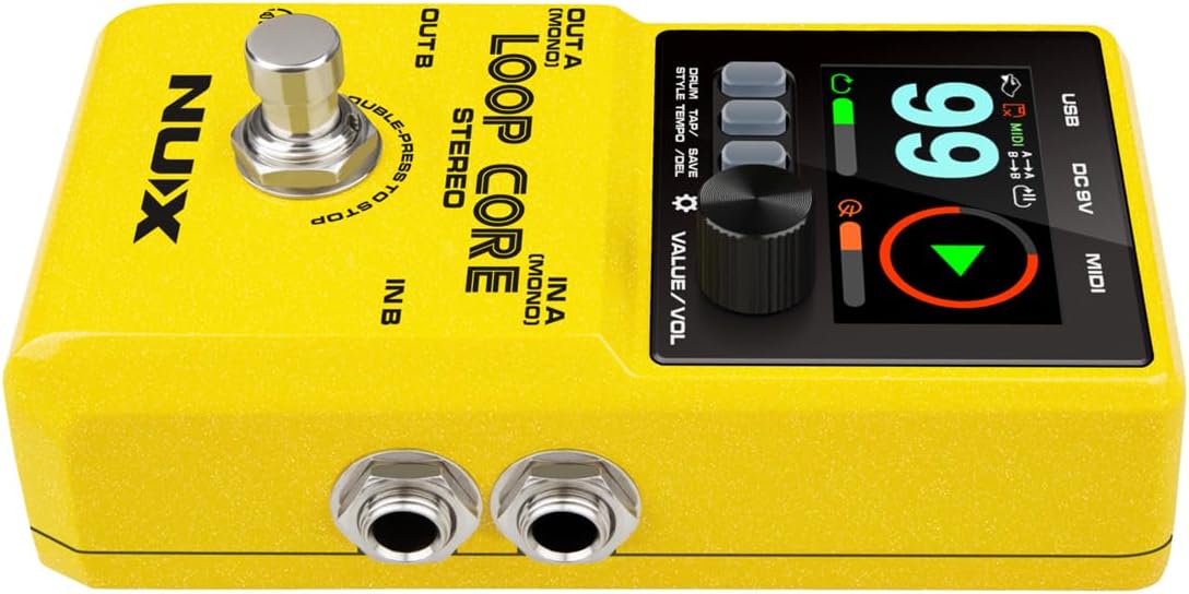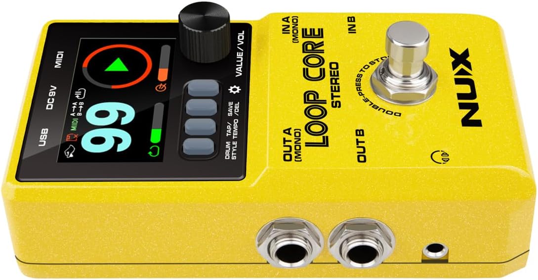 The NUX Loop Core Stereo is our next generation Looper pedal. Featuring a high-definition color LCD display, stereo inputs/outputs, and a MIDI control input; the Loop Core Stereo allows you to create up to 6 hours of music phrases, save them in one of 99 provided memory slots, and play back as stereo loops! Also included are 50 different drum patterns to complete the looping experience. Whether you practice, compose, or play live gigs, you’ll be inspired from the very first loop! Create and save your loops! It’s easy to create loops and practice with the NUX Loop Core Stereo. Power on the Loop Core Stereo pedal, rotate the VALUE knob to select an empty memory from 01 ~ 99, then you can press the foot switch to record/play/dub your loops. You can also hold the foot switch to UNDO/REDO/CLEAR. Turn the VALUE knob to select a memory slot between 01~99 or adjust parameters. When you are working on loops or practicing, press the VALUE knob once/twice to adjust the volume of Loop/Drum. MIDI Control Nearly every parameter of the Loop Core Stereo can be controlled by an external MIDI controller, such as tap tempo, stop/start/record, and so much more. The MIDI to 1/8” cable is included to get you started quickly. Customize your own Boot-up picture The Loop Core Stereo allows users to customize their own boot-up picture with a GIF. - Connect the Loop Core Stereo to your computer and download a GIF picture to the folder: NUX LOOPER > NUX_LOOP > GIF. - Disconnect and reboot the Loop Core Stereo, and then enter the DISPLAY setting and set the BOOT-UP PICTURE option to USER. - Reboot the Loop Core Stereo again. Enjoy your own customized GIF interface!
