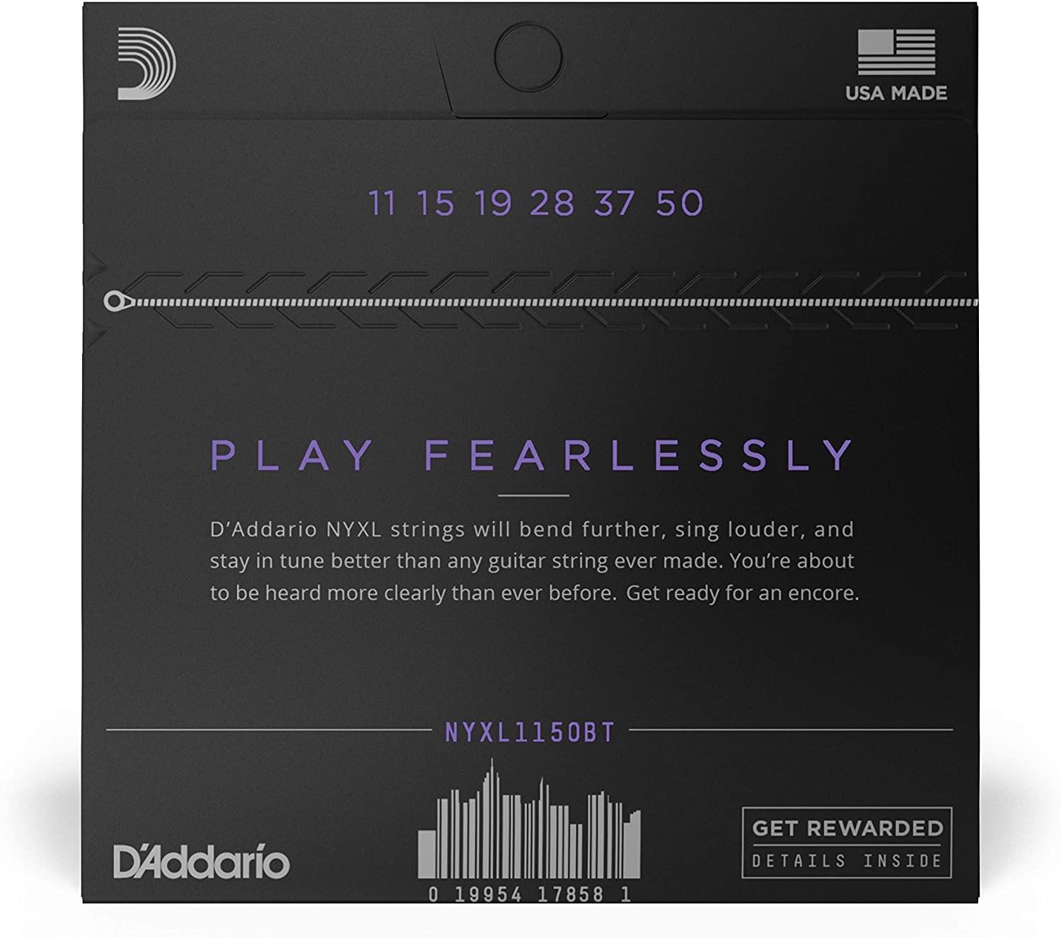 D’Addario NYXL guitar strings will bend farther, sing louder, and stay in tune better than any string you’ve played before. Envisioned, perfected, and manufactured by D’Addario in New York, this newly engineered, break-resistant, high-carbon steel core and plain steel alloy delivers a whole new level of freedom, confidence, and power. NYXL’s provide more strength and 131% greater tuning stability by utilizing a completely reinvented wire drawing process coupled with a revolutionary “fusion twist” process for the plain steels. The reformulated nickel plated string windings have greater magnetic properties resulting in higher output and enhanced mid-range frequency response for more presence and crunch.